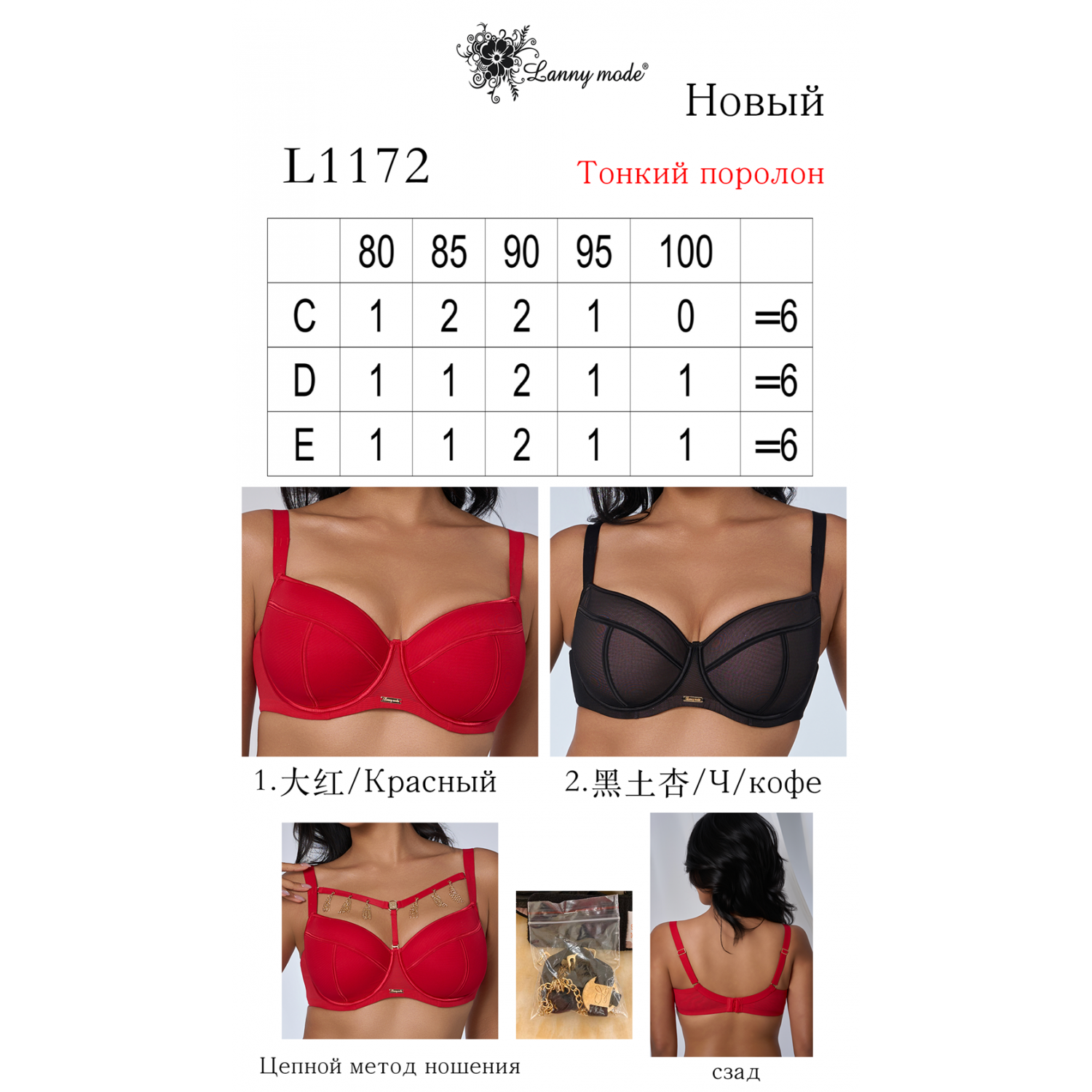 Бюстгальтер Lanny Mode на тонком поролоне. Бретельки несъемные, съемные стропы. Состав: 82% нейлон, 18% эластан.